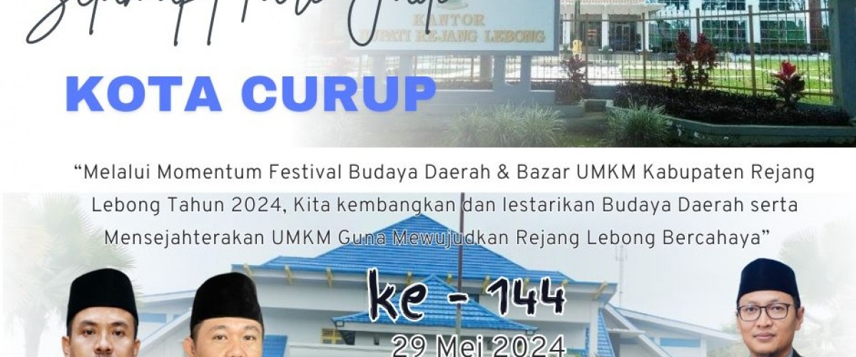 Sekretariat DPRD Kabupaten Lebong mengucapkan Selamat Hari Jadi Kota Curup ke - 144. “Melalui Momentum Festival Budaya Daerah & Bazar UMKM Kabupaten Rejang Lebong Tahun 2024, Kita kembangkan dan lestarikan Budaya Daerah serta Mensejahterakan UMKM Guna Mewujudkan Rejang Lebong Bercahaya”.