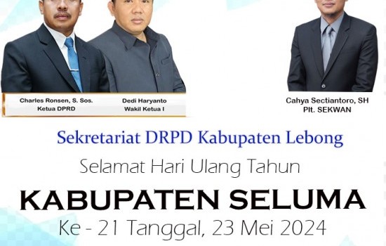 Sekretariat DPRD Kabupaten Lebong mengucapkan Selamat Hari Ulang Tahun Kabupaten Seluma ke -21 Tahun 2004. “ Majulah Seluma Ku Untuk Indonesia Maju“